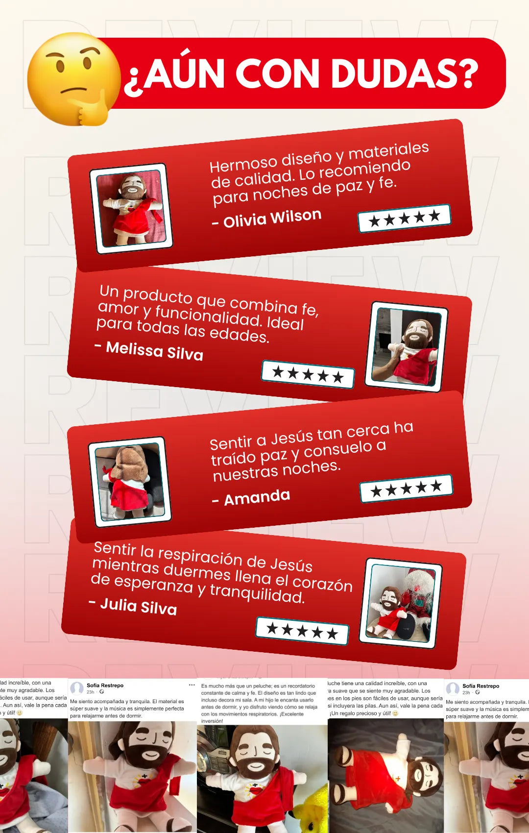 El peluche Jesús te envuelve con su música relajante y sus suaves movimientos respiratorios. Ideal para encontrar la calma perfecta y disfrutar de un sueño regenerador lleno de serenidad y fe.