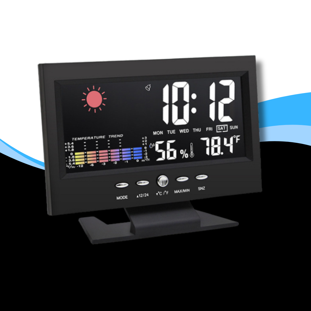 El reloj muestra la hora, el calendario, la temperatura actual, pronóstico del tiempo y un ícono que indica la tendencia meteorológica. Todo en una pantalla LCD clara y moderna.