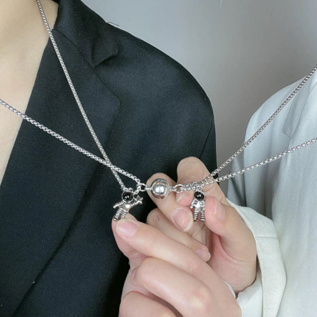 Cada collar cuenta con un sistema magnético que hace que, al acercarse, se atraigan y se unan automáticamente, simbolizando un abrazo profundo entre dos personas.