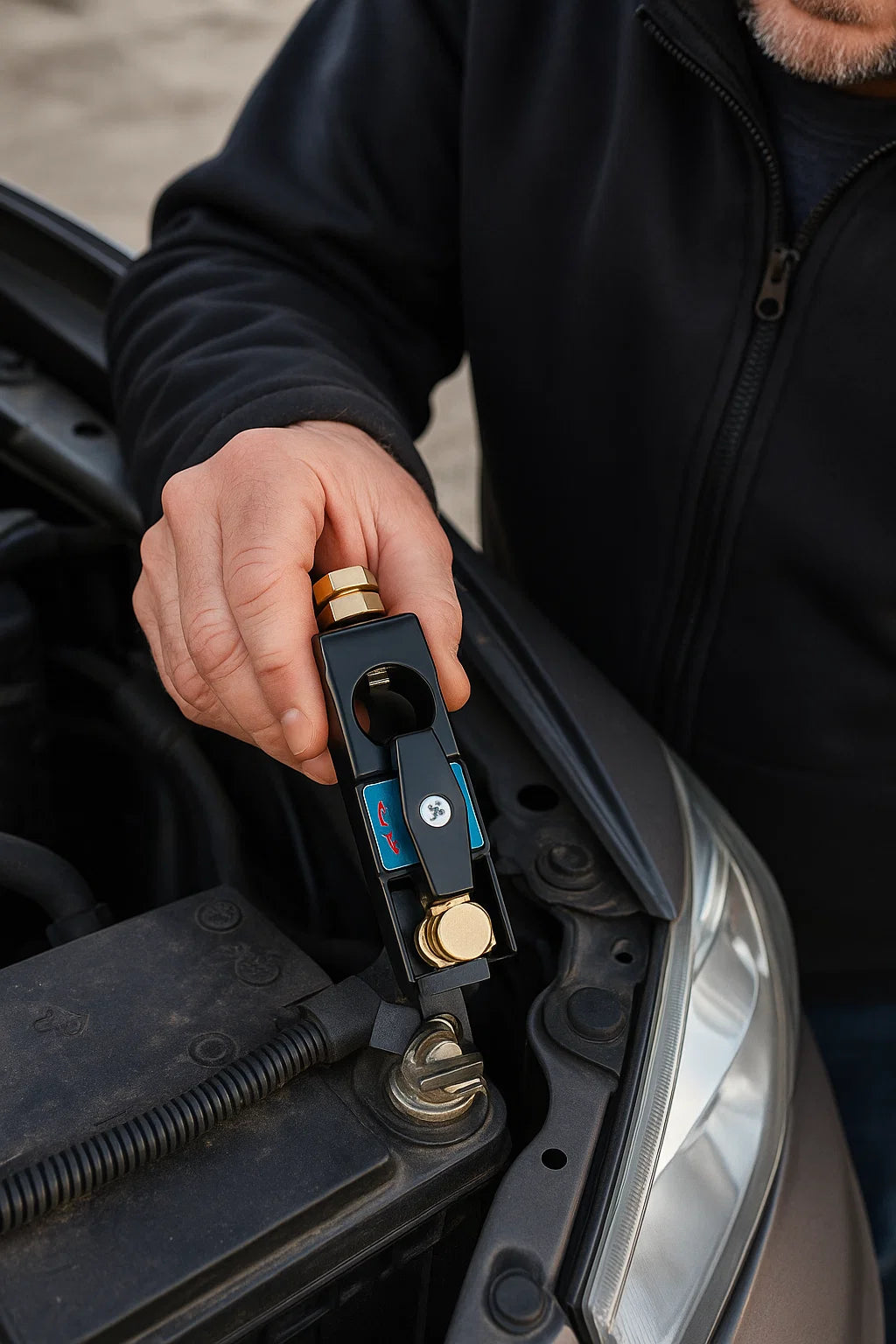 Solo colócalo en el borne negativo de la batería, ajusta la tuerca y listo. Luego, con un pequeño giro, desconectas o reconectas la energía en segundos.